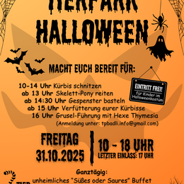 Halloween Fest im Tierpark mit Kürbisschnitzen, Geister basteln, Grusel-Buffet, wandernden Erschreckern, Pony Reiten & Grusel-Führung. Letzter Einlass 17 Uhr.