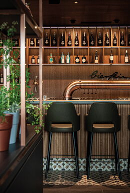 Innenaufnahme Gastraum Ristorante Esposito mit Esstischen und rustikalem Weinregal