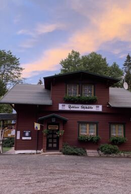 Außenaufnahme Imbiss zur Wallfahrt am Rennsteig mit überdachter Sitzgelegenheit und Dachterrasse