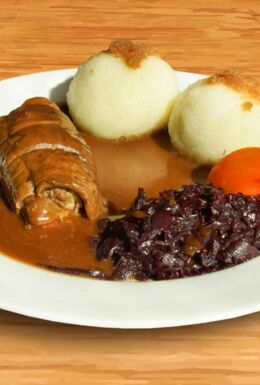 Gedeckter Tisch im Waldhotel Rennsteighof mit Rotwein, Gänsekeule und Thüringer Klößen