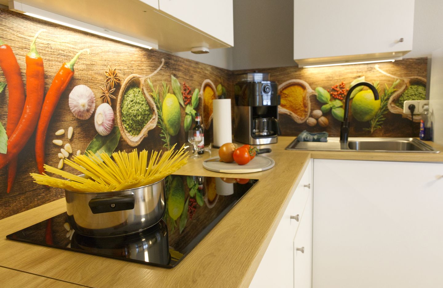 Das gemütliche Schlafzimmer mit einem komfortablen Doppelbett verspricht erholsame Nächte. Im Wohnzimmer lädt eine ausziehbare Doppelbettcouch zum Entspannen ein, während der TV für Unterhaltung sorgt. Die kleine, gut ausgestattete Küche bietet alles, was Sie für die Zubereitung kleiner Mahlzeiten benötigen, einschließlich Kochutensilien, Geschirr, Mikrowelle und einer Kaffeemaschine.